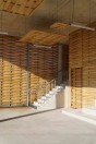 La médiathèque, positionnée au Nord ouvre sur un jardin clôturé tandis que l'ALSH profite au sud d'une extension neuve et ouvre sous la halle attenante dans la continuité du volume créé dont les brises vues sont tressés de lames de châtaignier. L'aménagement intérieur est lumineux, feutré et chaleureux. Il fait la part belle au bois: meubles intégrés, mobiliers, suspensions acoustiques et aux matières naturelles: linoleum, peintures et enduits.