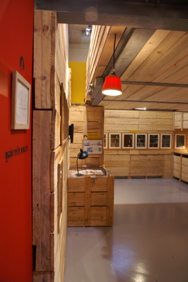 La salle d'exposition existante, étroite et métallique est investie par un empilement de caisses et d ...